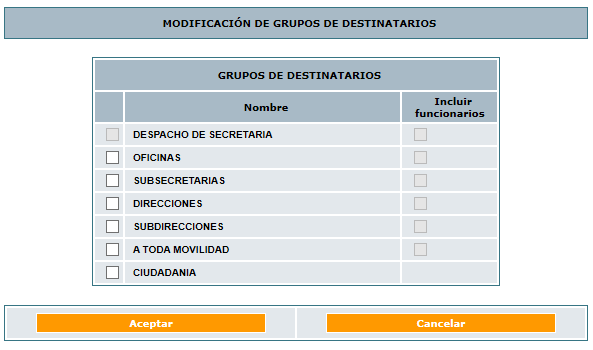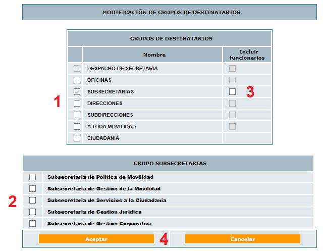 2. Al seleccionar el grupo, se despliega el listado de dependencias pertenecientes al grupo, seleccionar las requeridas