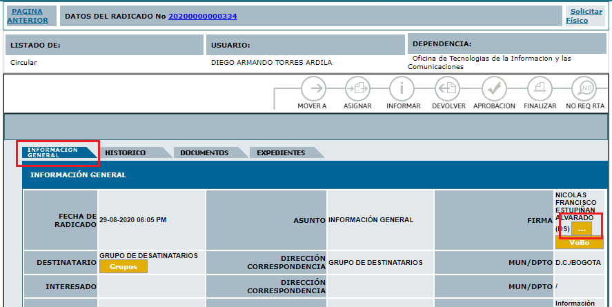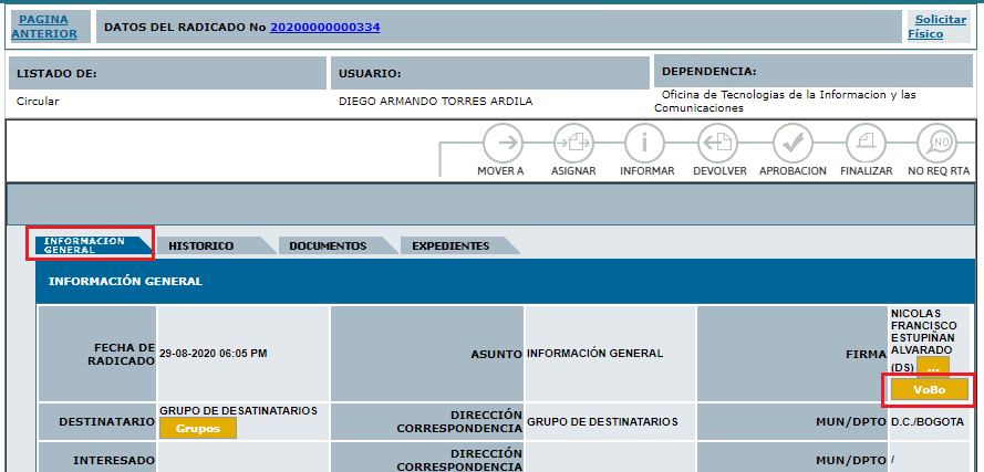 Si el radicado tiene validaciones adicionales a las revisiones y/o aprobaciones de los directivos, debe solicitarlas utilizando la acción