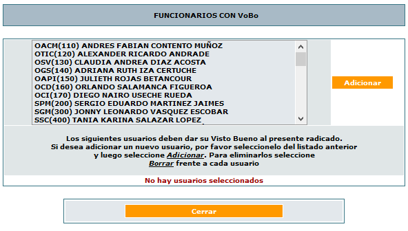 Seleccionar el directivo que dará la aprobación al radicado (Visto Bueno) y dar clic en el botón