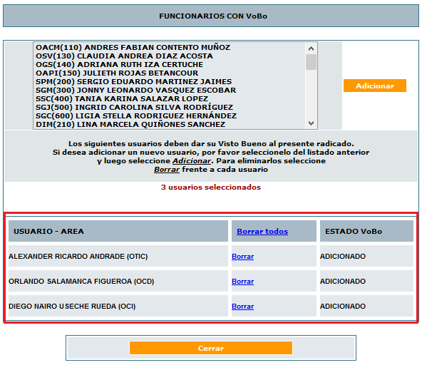 El sistema confirmará la acción en la parte inferior, mostrando el usuario que realizará la revisión y/o aprobación del documento, esta acción debe realizarse por cada uno de los directivos que requiera (puede seleccionar varios al tiempo, con la tecla CTRL y el puntero del mouse).