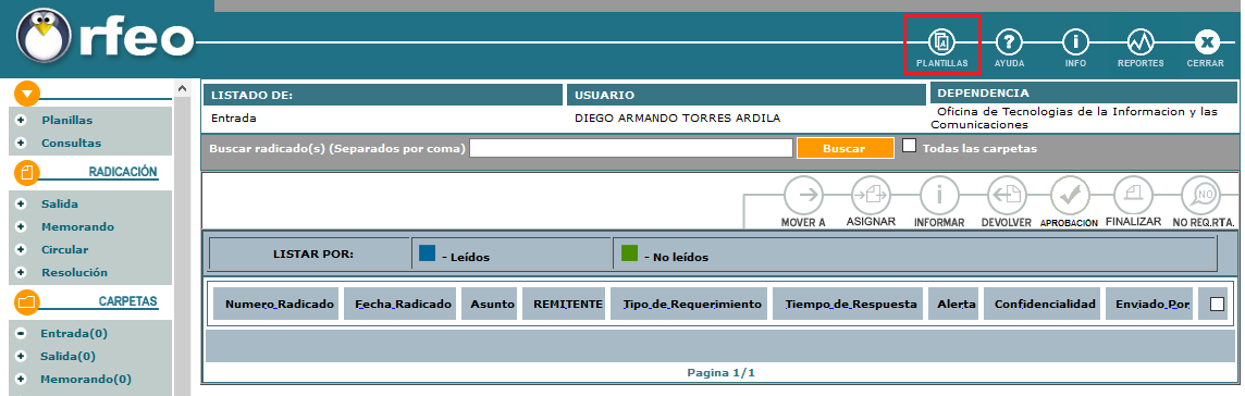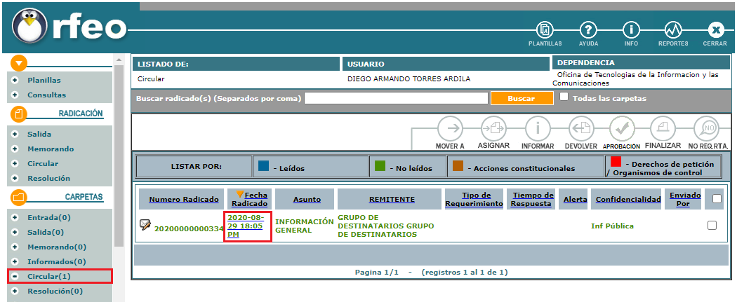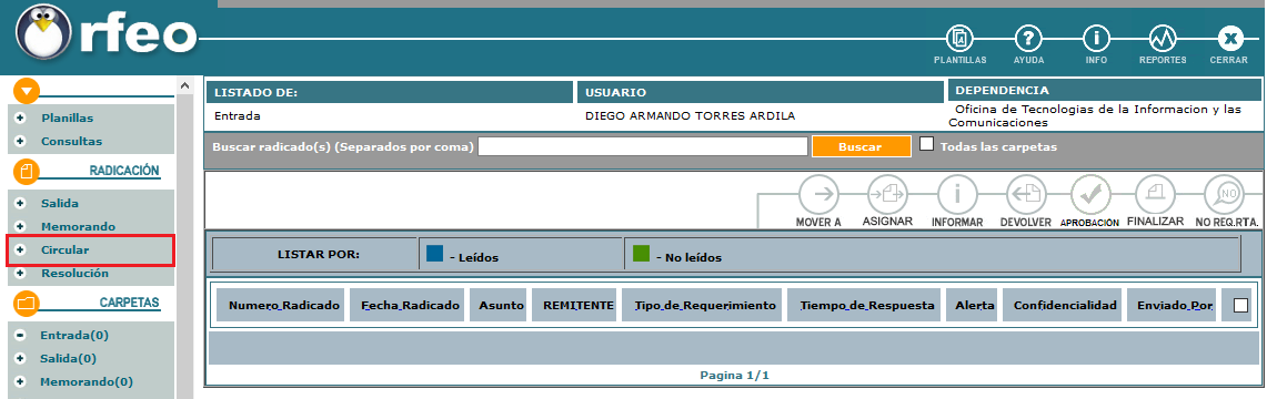 Una vez generada la plantilla, debe seleccionar la opción Circular del módulo de radicación.