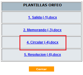 El sistema sobrepone una ventana para seleccionar el tipo de plantilla según la opción a radicar, para este caso Circular (-4)
