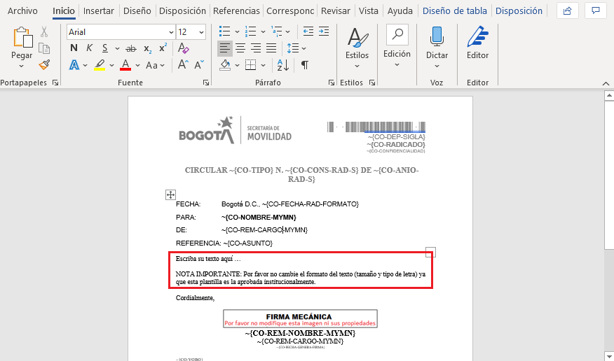 La plantilla tiene variables, letras entre el símbolo (~~) y mayúsculas sostenidas, que son reemplazadas por los campos seleccionados al momento de la radicación. Debe realizar la proyección de respuesta en el campo resaltado