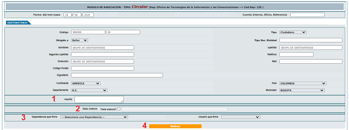 El sistema muestra el formulario de radicación de circulares, con el usuario "Grupo de Destinatarios" automáticamente, donde debe diligenciar la siguiente información: